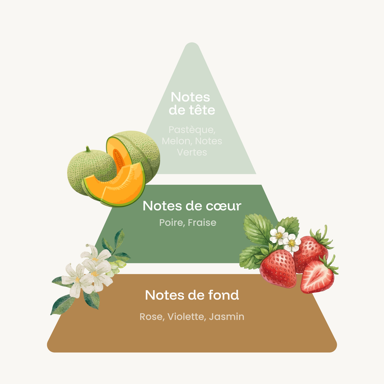 En cœur, la douceur fruitée de la poire s’associe à la gourmandise de la fraise, créant un équilibre délicat et irrésistible. Enfin, les notes de fond florales de rose, violette et jasmin viennent sublimer la composition avec élégance et légèreté, laissant un sillage doux et raffiné.