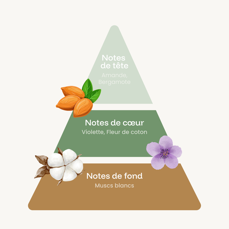Fleur de Coton enveloppe vos sens d’une douceur légère et apaisante, idéale pour créer une atmosphère sereine et raffinée. L’ouverture marie la délicatesse de l’amande à la fraîcheur pétillante de la bergamote, pour une première impression douce et lumineuse. Le cœur révèle un bouquet tendre de violette et de fleur de coton, qui apporte pureté et élégance à la composition. En fond, les muscs blancs offrent une touche soyeuse et durable, sublimant le parfum avec subtilité et raffinement.