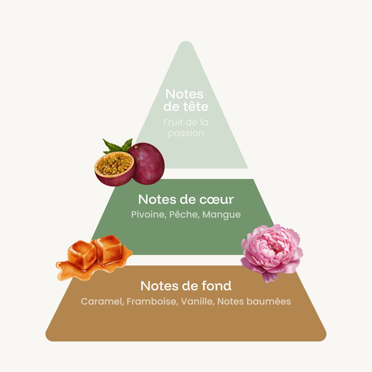 Succombez à l’exotisme et à la gourmandise du Fruit de la Passion, un parfum vibrant et ensoleillé qui transforme vos créations parfumées en véritables invitations à l’évasion. Il s’ouvre sur la fraîcheur intense du fruit de la passion, suivie d’un cœur fruité et délicat où la pivoine, la pêche et la mangue se mêlent avec harmonie. Le fond révèle des notes gourmandes et chaleureuses de caramel, framboise, vanille et touches baumées, pour un sillage à la fois sensuel et enveloppant.