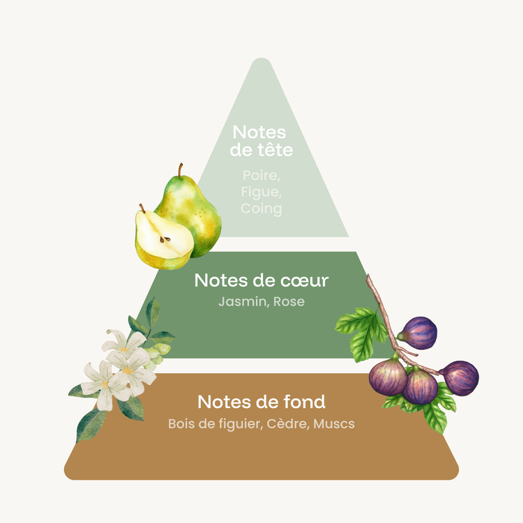 Laissez-vous séduire par Poire et Bois de Figuier, une fragrance fruitée et élégante qui marie la douceur des fruits mûrs à la chaleur boisée du figuier. Les notes de tête de poire, de figue et de coing offrent une ouverture juteuse et lumineuse, évoquant la fraîcheur d’un verger baigné de soleil. Le cœur dévoile un bouquet délicat de jasmin et de rose, apportant une touche florale raffinée. En fond, les accords de bois de figuier, de cèdre et de muscs prolongent cette harmonie en un sillage doux, rond et apaisant.
