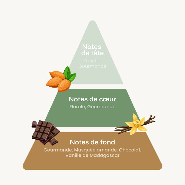 Notes de fond : Gourmande, Musquée amande, Chocolat, Vanille de Madagascar