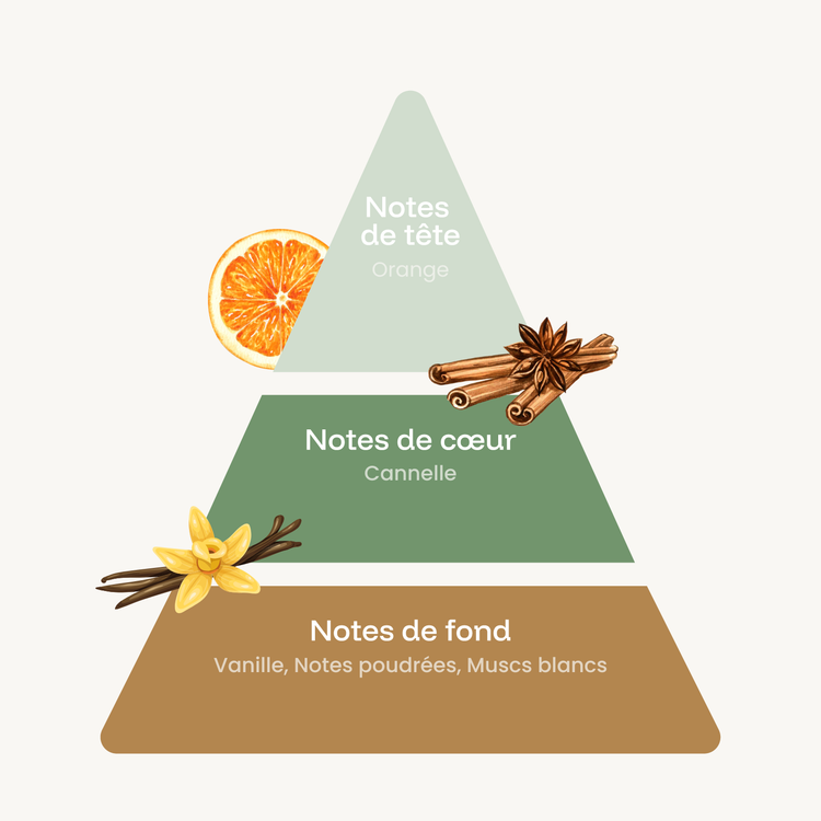Succombez à l’alliance chaleureuse et épicée du parfum Cannelle Orange, une fragrance gourmande et réconfortante idéale pour vos bougies parfumées et diffuseurs d’intérieur. L’ouverture vive et pétillante de l’orange apporte une fraîcheur fruitée, rapidement sublimée par un cœur épicé de cannelle qui diffuse chaleur et intensité. En fond, la vanille, les notes poudrées et les muscs blancs prolongent l’expérience avec une touche douce, enveloppante et élégante.
