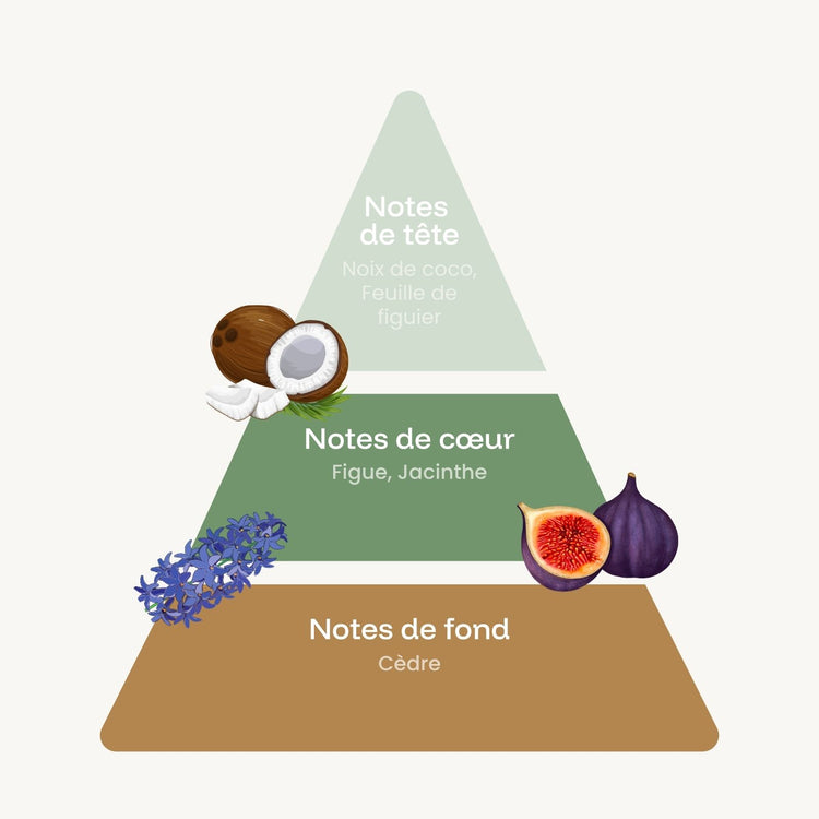 Figue invite à un voyage gourmand et végétal, alliant douceur fruitée et fraîcheur naturelle. L’ouverture s’illumine de la noix de coco et de la feuille de figuier, pour une première impression douce, légèrement exotique et rafraîchissante. Le cœur révèle toute la richesse de la figue associée à la délicatesse de la jacinthe, apportant rondeur et subtilité au parfum. En fond, le cèdre offre une note boisée, élégante et persistante, qui prolonge le sillage avec raffinement.
