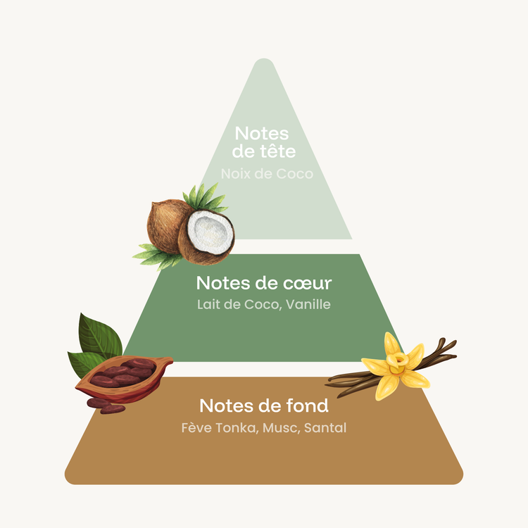 Invitez l’exotisme et la gourmandise dans vos créations avec le parfum Noix de Coco, une fragrance solaire et dépaysante, idéale pour vos bougies parfumées et diffuseurs d’intérieur. L’ouverture met en lumière la fraîcheur et la douceur de la noix de coco, immédiatement réchauffée par un cœur onctueux mêlant lait de coco et vanille. Enfin, la profondeur des notes de fève tonka, de musc et de santal vient envelopper l’ensemble d’une chaleur boisée et sensuelle, pour un sillage doux et réconfortant.