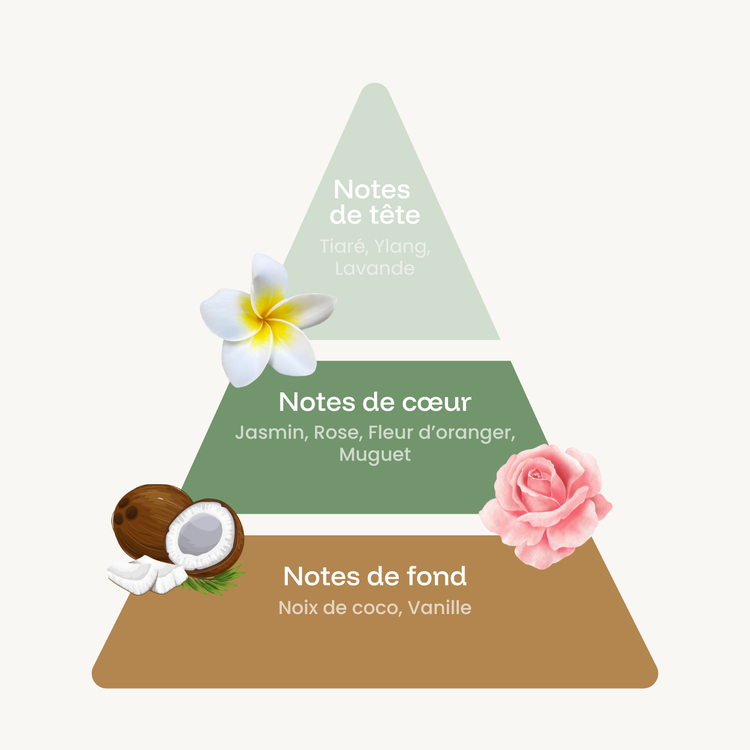 Laissez-vous transporter dans une ambiance exotique et envoûtante avec le parfum Tiaré, qui évoque des paysages tropicaux et une douceur solaire. Les notes de tête de tiaré, ylang et lavande apportent une ouverture fraîche et florale, tandis que le cœur généreux de jasmin, rose, fleur d’oranger et muguet enveloppe l’espace d’un bouquet floral délicat et raffiné. La base gourmande de noix de coco et de vanille laisse une empreinte chaleureuse et réconfortante.